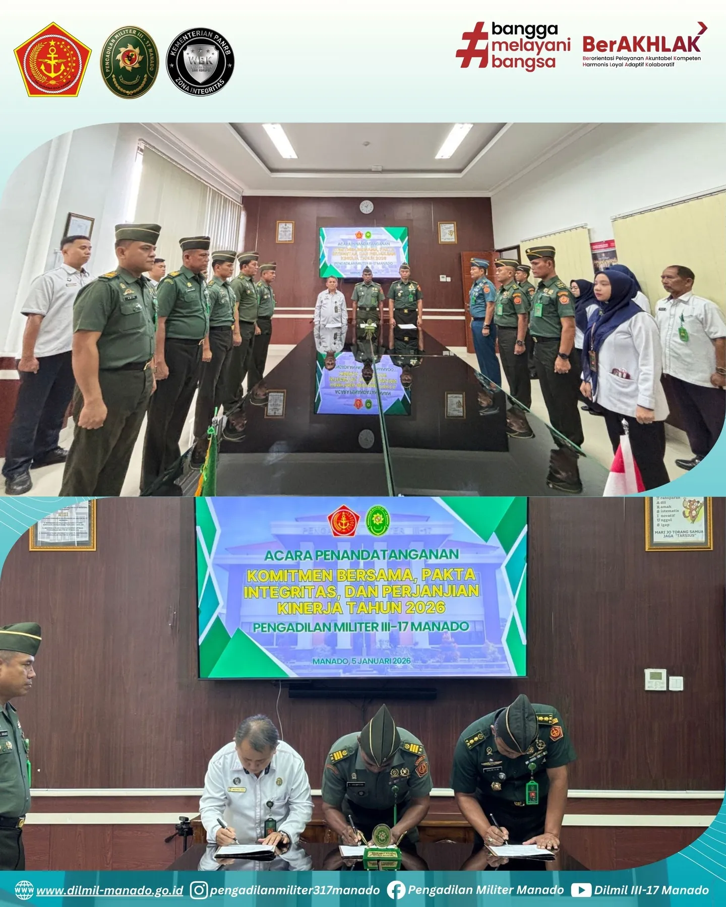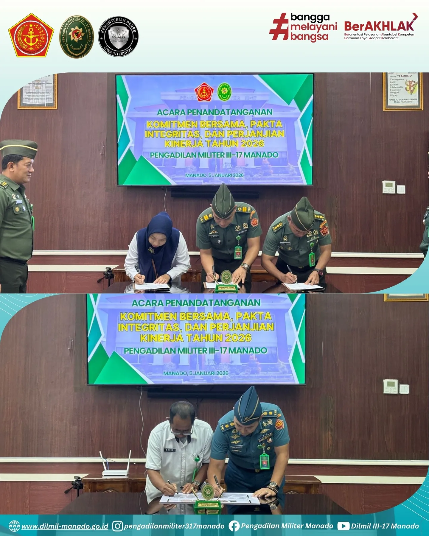 Bertempat di Ruang Media Center, Pengadilan Militer III-17 Manado melaksanakan Penandatanganan Komitmen Bersama, Pakta Integritas, dan Perjanjian Kinerja Tahun 2026.